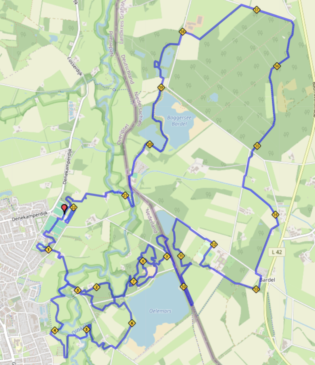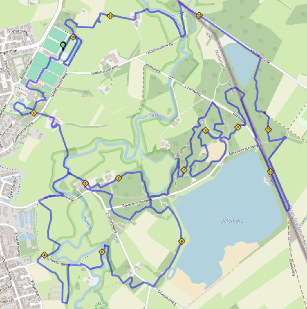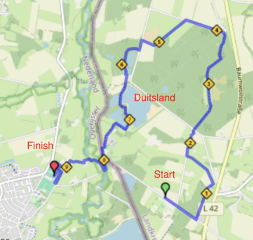 De start is op onze accommodatie en leidt u eerst via de sportvelden naar het culturele erfgoed Erve Kraesgenberg met een aantal historische gebouwen. Na de hindernissen in een rijhal voor paarden volgen de kilometers door het Dinkeldal deels langs het meanderende riviertje de Dinkel en over oude boerenerven. Via een klootschietbaan wordt natuurgebied de Zandbergen aangedaan over smalle slingerende bospaden met wat hoogteverschillen en een kleine zandverstuiving. Daarna kom je de eerste commies tegen bij de grensovergang, waarna de route wordt vervolgd rondom het fraaie Duitse klooster Bardel. Op weg naar het verste punt van de 27 km trail wordt het Bentheimer Wald doorkruist (Let op: aanwezigheid van wilde zwijnen). Over paden nabij een zandafgraving kom je weer Nederland in, dus weer oppassen dat je niet gepakt wordt door de commies. Voor de grensovergang voegt de 14,5 km trail zich weer in. Via een smal pad langs de Dinkel komt u weer over een boerenerf (met een enorme stier!) en gaat het via de weilanden naar de finish op onze accommodatie. Er is tijdregistratie aanwezig.