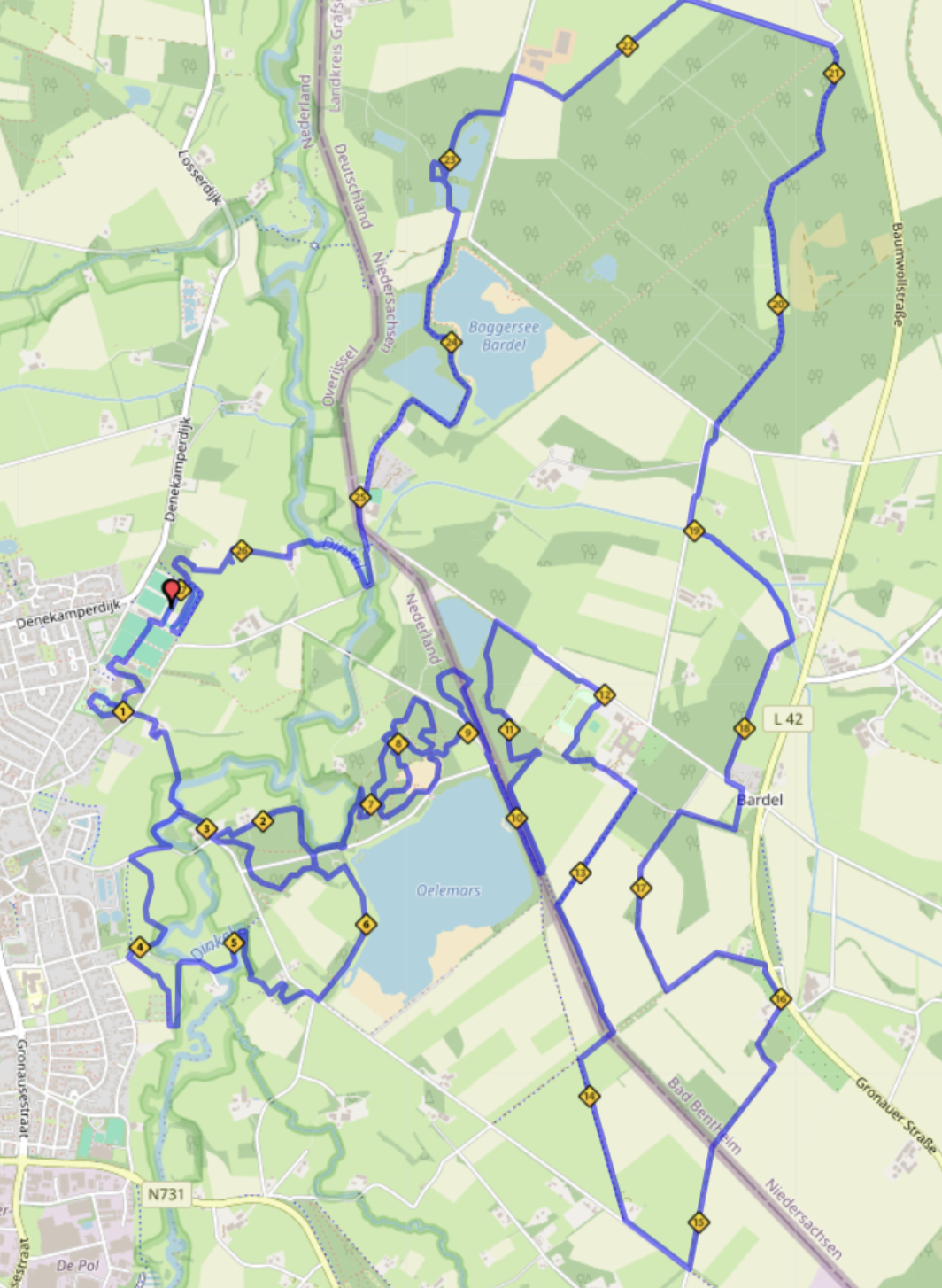 Je wordt naar de startlocatie gebracht bij het fraaie Duitse klooster Bardel. Daar start het avontuur en voeg je na 500 meter in op het parkoers van de lange trailrun. Deze gaat eerst naar het verste punt op de route in het Bentheimer Wald dat wordt doorkruist (pas op voor wilde zwijnen!). Over paden nabij een zandafgraving kom je weer Nederland in, daar moet je boter de grens over smokkelen, dus oppassen dat je niet gepakt wordt door de commies. Via een smal pad langs de Dinkel kom je weer over een boerenerf (met een enorme stier!) en gaat het via weilanden naar onze accommodatie waar de finish volgt.
